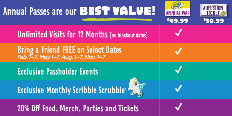Crayola Experience Annual Passholders enjoy a full year of hands-on creativity with no blackout dates, exclusive perks, discounts on food, merchandise, parties and tickets, bring a friend FREE opportunities, invitations to Passholder-only events and more!