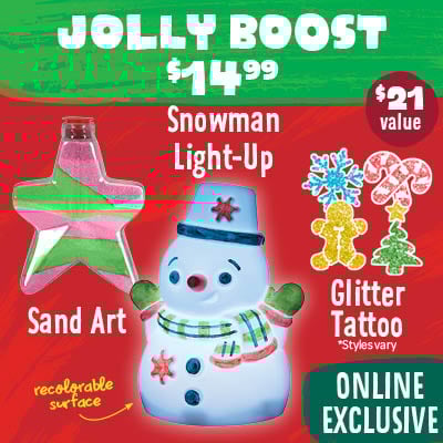 The Jolly Boost packs in fun-filled holiday activities and includes 1 small sand art creation, 1 recolorable Snowman Light Up, and 1 glitter tattoo.