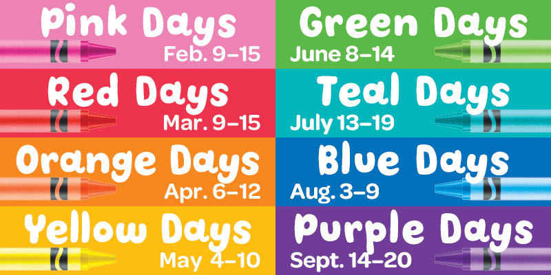 We’re celebrating color and adding a splash of fun with Color Days! Are you a feisty fuchsia or a cool blue? On Team Green? Part of the un-mellow yellow crowd or RED-y to shine?