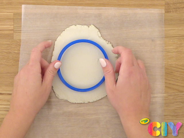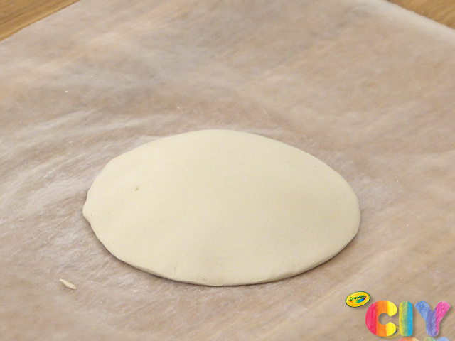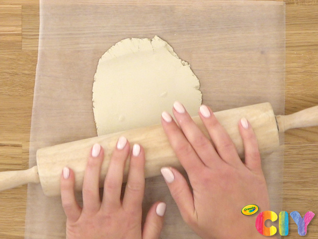 On a piece of wax paper, roll out a 1/2” thick, medium-size air dry clay ball.