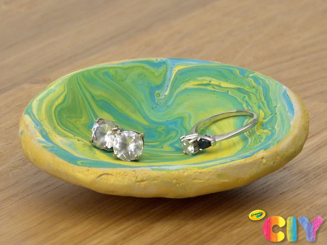 Create DIY jewelry storage with a marbleized paint effect! This clay craft is easy to make and air dries overnight.