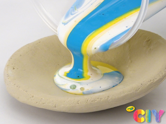 Pick up dish and gently rotate in a circular motion until paint covers the entire dish. Pour any excess paint back into the cup. Dry 1–2 hours.