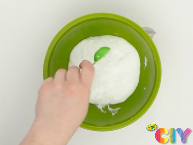 Add contact lens solution in 1/2 tsp increments. Mix the contact lens solution in each time it’s added, up until 3 tsp have been added or until the slime mixture is easily coming off the bowl.