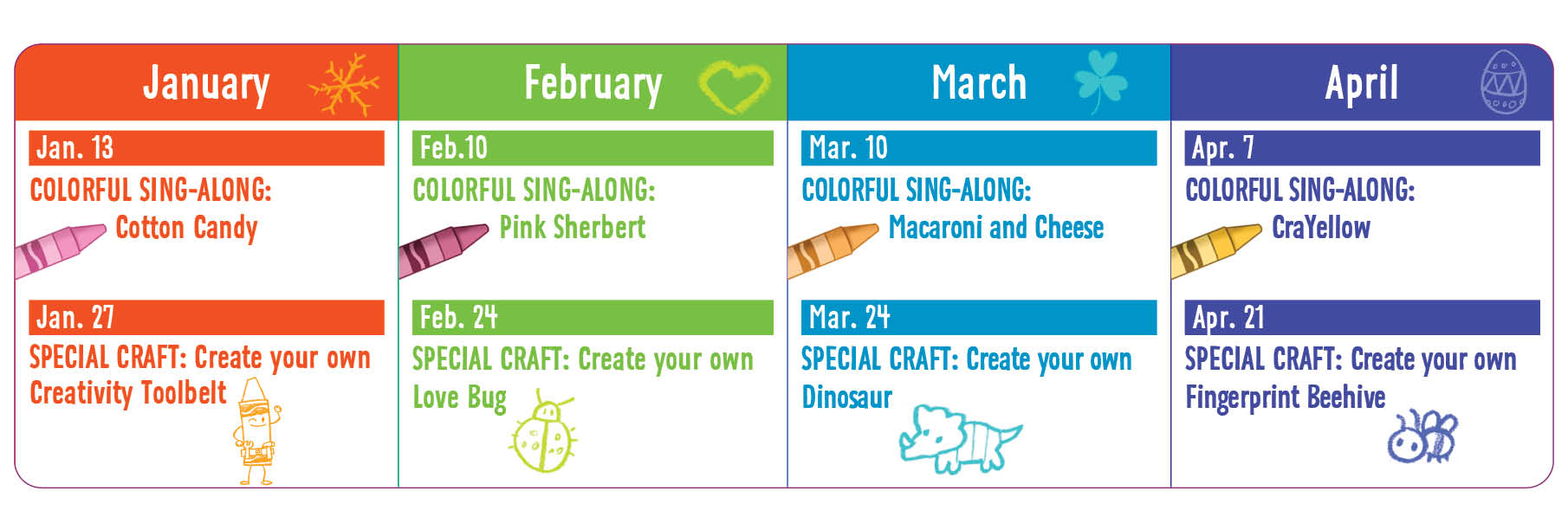 Join us on select Tuesdays* from 10am-12pm for hands-on activities and creative play designed just for little ones! Enjoy an interactive sing-along featuring the Colors of Kindness: Pink Sherbert (Have a scoop of fun) at 10:30am! Plus, we'll have plenty of toddler friendly products to play with and a character appearance at 11:30am